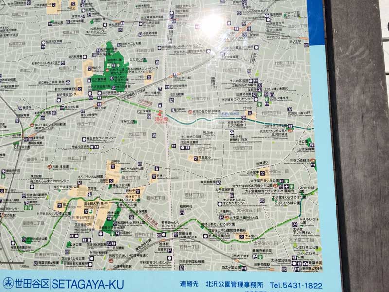 地図右下に表示されている三茶の駅から緑道沿いに(地図は途中切れているけど)