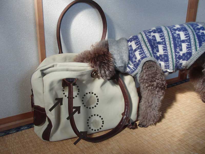 で、持っていく鞄を見てみたら、シミがついてる〜!!!