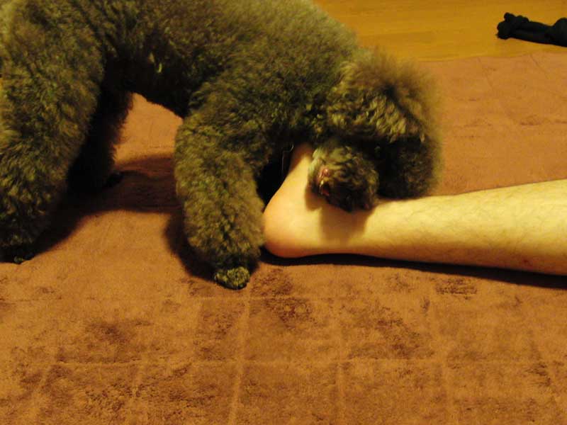 旦那さんの足に戦いを挑むぷるぷる。