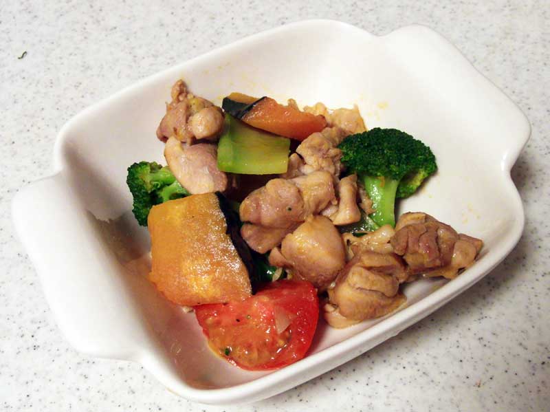 (昨日のしょうがシロップのしょうがの方を刻んで鶏肉に揉み込んだもの) - かぼちゃを炒める