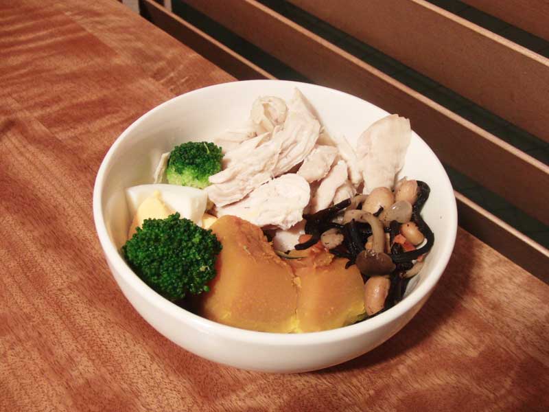 • とり胸肉、ブロッコリー、ゆで玉子のサラダ