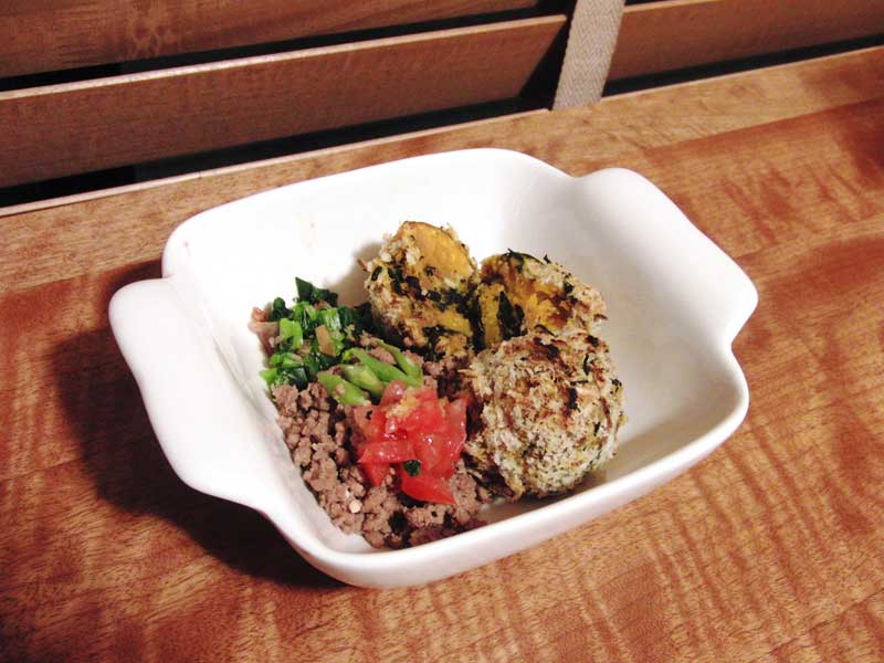 - 先日のかぼちゃを潰してそこに炒めた挽肉ともどしたひじきを入れる