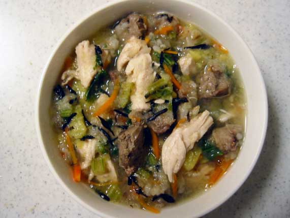 - 冷凍しておいた鶏ムネと鶏キモを鍋に入れる