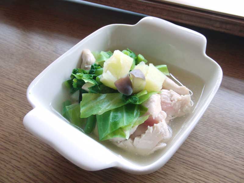 - 出汁で大根の葉、キャベツ、なす、いんげん、じゃがいもを煮る