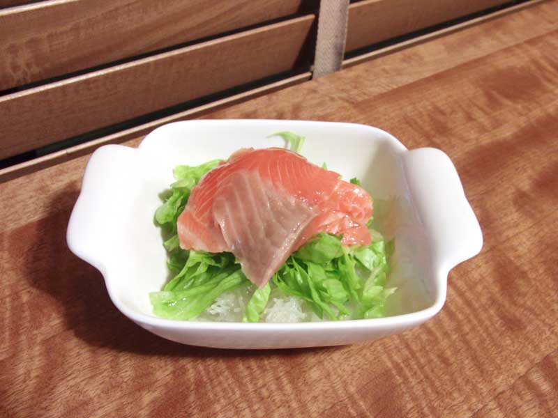 ぷるぷるちゃん、サーモンの刺身かぁ