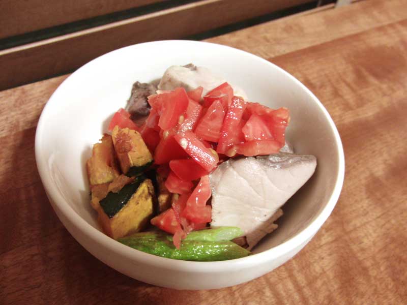 • カツオとかぼちゃ、アスパラをオリーブオイルで焼く