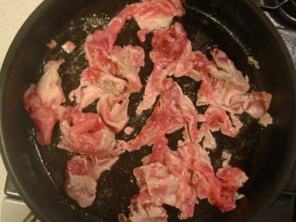 豚バラ肉(こま切れ)を中火で炒める