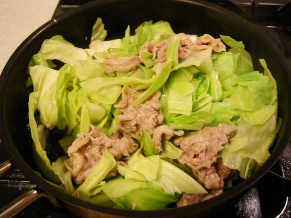 豚肉に半分くらい火が通ったらざく切りキャベツをたっぷり入れる