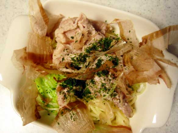 皿に盛ったらかつをぶしとあおのりをトッピング