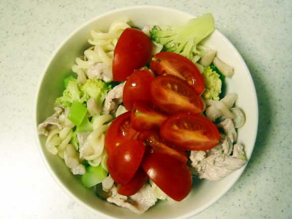 • パスタ、ブロッコリー、豚肉、しめじを同じ鍋で煮る