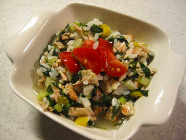 (ほうれん草、アスパラ、おかひじき、パプリカ、サニーレタス) - 鮭(焼いておいたもの)とごはんをいれる